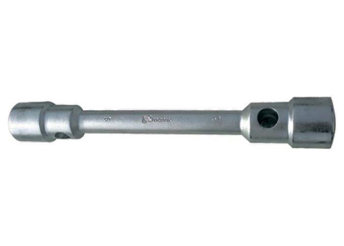 Ключ баллонный двусторонний торцевой изготавливается из углеродистой стали. Твердость материала рабочих частей ключа 41 HRс, что соответствует требованиям ГОСТа. Защитное покрытие выполнено из цинка. Ключ имеет 2 торцевые головки с 6-гранным зевом. Благодаря утолщенному диаметру прута (26 мм), ключ обладает более высокими прочностными характеристиками и длительным сроком службы. Применяется для установки и демонтажа колес грузовых а м и автобусов.